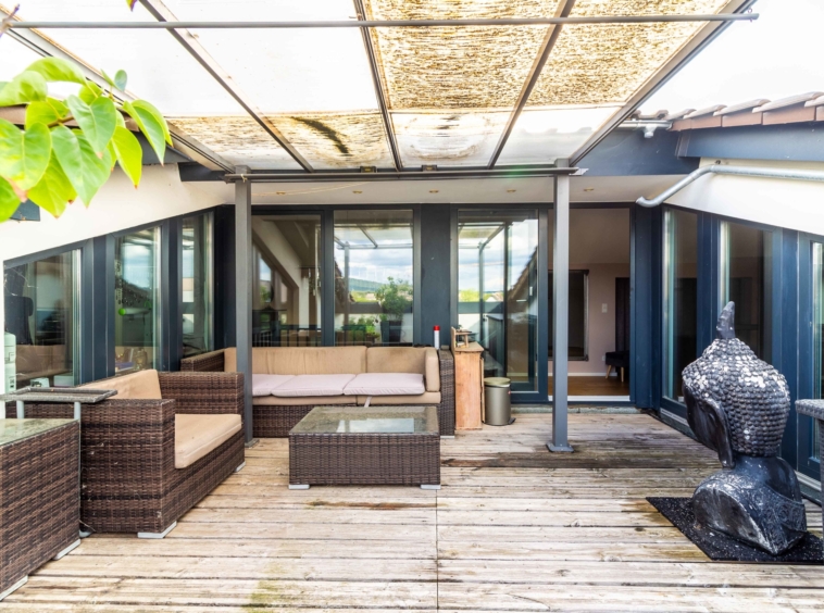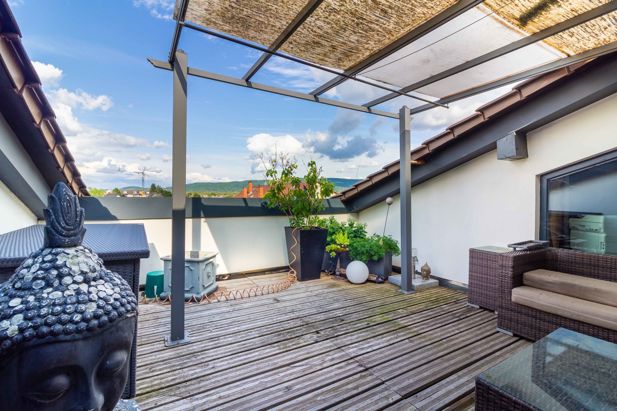 – Dachterrasse mit ca. 20 m² und herrlichem Blick auf die Bergstraße und Burg Frankenstein