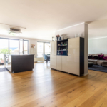 Der lichtdurchflutete Wohn- und Essbereich überzeugt mit raumhohen Fensterflächen, die Innen- und Außenraum harmonisch miteinander verbinden. Die offen gestaltete Küche mit hochwertigen Einbauten und direktem Zugang zur weitläufigen Terrasse bildet den Mittelpunkt des familiären und gesellschaftlichen Lebens.